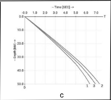 Fig. 2.b are presented graphs for the same epicentral distances, but as a subrahend was taken the origin time at depth $h^f = 12.5 \, km$. It is demonstrated that characteristics cross in one point corresponds to the focus depth. Fig. 2.c. presented comparing the dependence of a depth of the origin time on the characteristics and the origin time on the rupture time. Line 1 is the characteristic origin time with $r_m = 25^\circ$, line 2 is the characteristic origin time with $r_m = 100^\circ$; line 3 is the rupture line origin time. The results obtained for the event 2022-01-07 17:45:34 in China.
