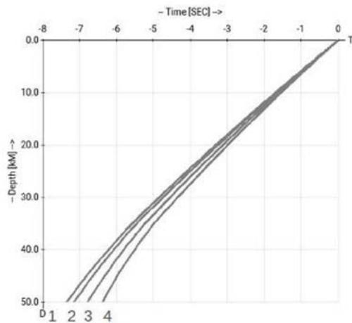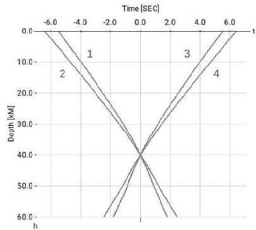 $P$ and $pP$ characteristics due to epicentral distances. 1- $P$ characteristic for $r = 25^{\circ}$, 2 - $P$ characteristic for $r = 175^{\circ}$, 3 - $pP$ characteristic for $r = 25^{\circ}$, 4 - $pP$ characteristic for $r = 175^{\circ}$. Zero on time axis corresponds to origin time, values on time axis are differences between phase origin time on depth zero and $t_0^{W}(h)_{h=h^f}$ which is the origin time on the rupture line. Crossing point corresponds to depth $h^f = 40.0 \, km$.