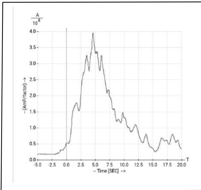 Fig. 8 shows a plot for the event 2022-01-07 17:45:34 in China. The curve of Fig. 8 is $AmP(t)$ generalized parameter calculated for $h = 0$ along the timeline in time interval $t = (-5, \dots, 20)$ sec. (Term generalized means: $AmP(t) = \frac{1}{M} (\sum_{m=1}^{M} AmP_m^P(t,h))_{h=0}$, where $M$ -number of used seismic records.)