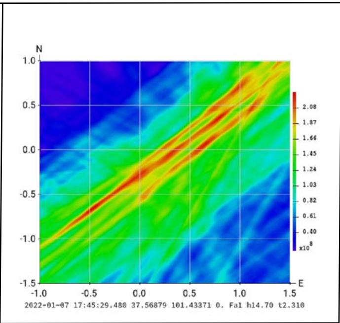 Fig. 5: Example of location data processing of the event 2022-01-07 17:45:34 in China. This presents two graphs of values of the amplitude parameters: 1 - phase
