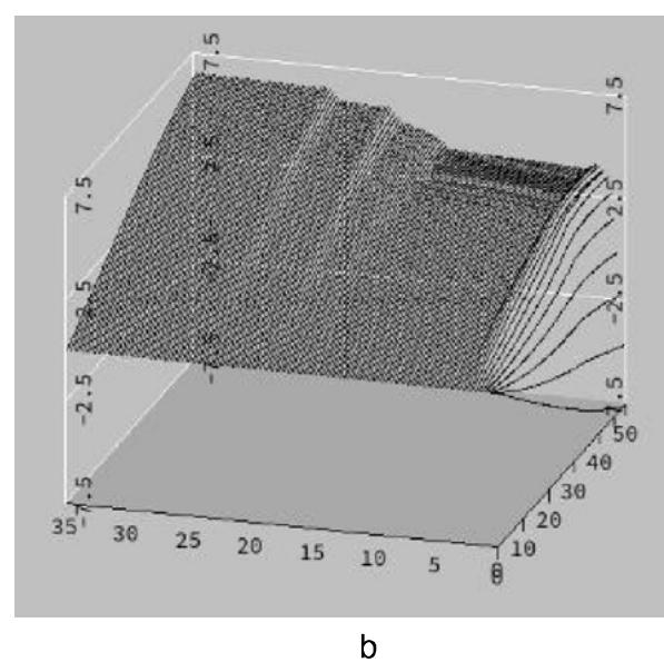 $t(r,h) = (\gamma^{P}(r,h) - \gamma^{P}(r,0))$ which is a difference of $t_m^0 (r,h)$ and $t_m(r,h)_{h = 0}$, where $m =$ index over epicentral distances The plot is drawn for argument value intervals: a - $r = (2,\dots,175)^{\circ}$, $h = (0,\dots,50)km$, b - $r = (0,\dots,35)^{\circ}$, $h = (0,\dots,50)km$. There are easy to see different zones distributed by epicentral distances: first - local zone, second - regional zone, third - transmission zone and fourth - teleseismic zone. The travel time table for the $P$ phase has one degree gap.