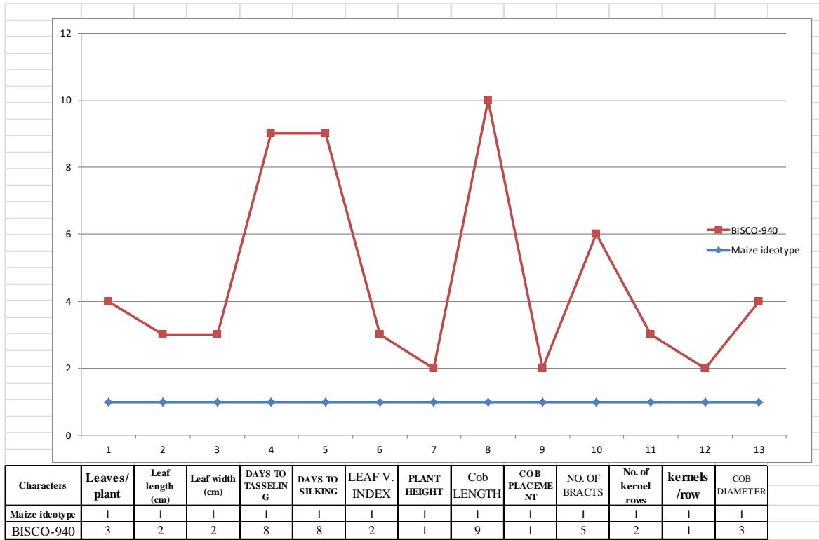 Table 3 shows the preference order of varieties that should be considered by farmers for selecting suitable maize ideotype for cultivation in their fields in this region. Thus top five varieties namely BISCO-940, KAYERI 25K-60, H4226, TATA 849 and TMMH826 could be recommended for trials. As per table 3, the most suitable variety BISCO-940 could be improved further by paying attention to characters like cob length (ranking $9^{\text{th}}$ ) and days to tasseling and days to silking (both ranking $8^{\text{th}}$ ) by crossing it with TMMH826 (ranking $1^{\text{st}}$ in all these three characters). The equal values of CR (and hence NCR) of H4226 and TATA 849 indicate that although both these varieties are equally good, yet they may differ in their ranks of various characters like plant height and number of bracts. If, by chance, the cross between BISCO-940 and TMMH826 proves to be heterotic, then a hybrid between these may be thought of and tried. Otherwise synthetic and composite varieties could be tried involving top few varieties. Thus, this analysis opens up a lot of potentials in maize breeding and recommending suitable maize ideotypes. Inbreds could also be analyzed like this to make single cross hybrids or try other potentials. This analysis has been used in many other crops also (Singh 2017, 2018; Singh and Kant 2022, Singh et al. 2018; Singh and Tiwari 2020 and Yadav et al. 2020). The top performer maize variety of this experiment BISCO-940 is also compared graphically as shown in Figure 1 with the maize ideotype being imagined. This graph shows scope for further improvement in most of the characters of the top performer maize variety BISCO-940 except plant height, cob placement and kernel rows. This means that BISCO-940 is at par with maize ideotype in these three characters only. Rest of the characters need maize breeders' attention to improve this variety further.