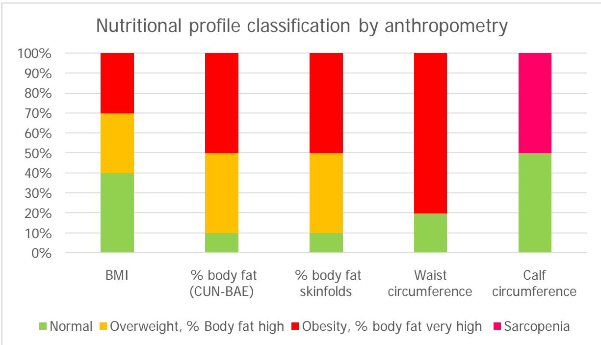 In the anthropometric tests, the average weight was $67.02 + / - 8.56$ (range: 53 to $81.5\mathrm{kg}$ ), and the median height was 1.58 (range: 1.48-1.62), the median BMI was overweight (BMI: 27.59; range: 20.2-32.65), and the median percentage of body fat by CUN-BAE formula and by summation of skin folds was obesity (CUN-BAE: 40.32; range: 24.9-46.29; skinfolds: 39.05; range: 24.7-45.7). In addition, the majority of patients had malnutrition of the sarcopenic obesity type in all the tests applied (Figure 3); With the Sheldon somatotype, most patients were classified as having an endomorph profile $(70\%)$, followed by an ectomorph profile $(20\%)$; with BMI, the highest proportion was overweight $(30\%)$ or obese $(30\%)$; with the CUN-BAE formula and with skin folds, the majority of patients had a high $(40\%)$ and very high $(50\%)$ percentage of body fat; with waist circumference, the highest proportion had abdominal obesity $(90\%)$ and with calf circumference, half of the population had sarcopenia.