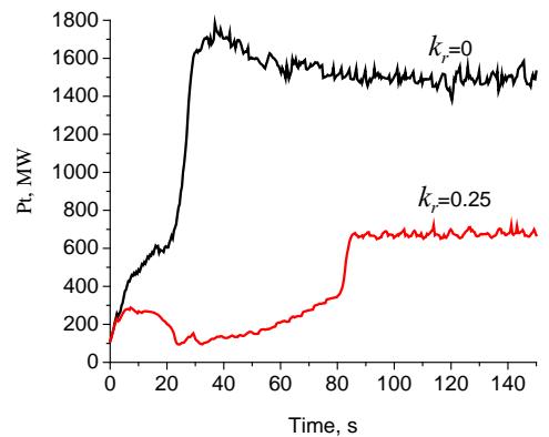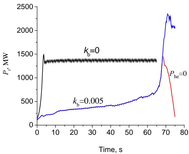 Figure 4: Time dependences of the thermonuclear power of the reactor at $k_{\mathrm{b}} = 0.005$ and in the absence of anomalous losses- $k_{\mathrm{b}} = 0$, $P_{\mathrm{he}} = 120 \, \mathrm{MW}$, $< n > = 2.1 \cdot 10^{20} \, \mathrm{m}^{-3}$, $E_{\mathrm{n}} = 7 \, \mathrm{eV}$, $k_{\mathrm{r}} = 0.25$, $\Delta = 0.75$.