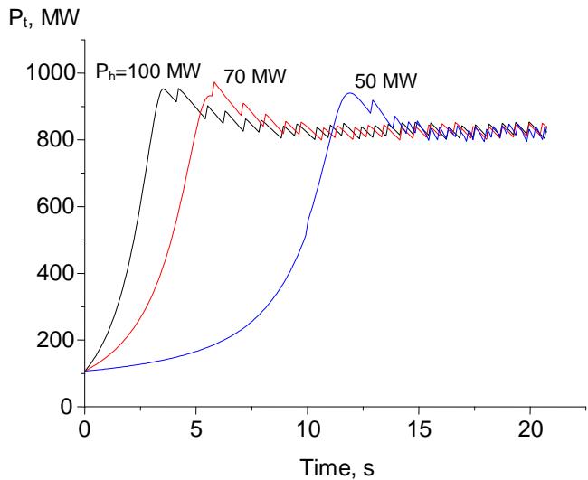 Figure 1: Time dependences of the fusion power of the reactor when using heating sources of different power. $P_{\mathrm{he}} = 50$, 70, 100 MW, $< n > = 1.9 \cdot 10^{20} \mathrm{~m}^{-3}$, $k_{\mathrm{r}} = 0.5$, $E_{\mathrm{n}} = 50 \mathrm{eV}$, $\Delta = 0.75$.