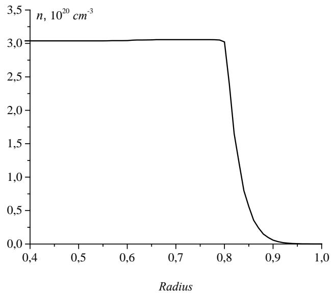 The density of neutral atoms in the space between the reactor wall and the plasma boundary turns out to be several orders of magnitude lower than the plasma density in the containment volume, grows as the fraction of particles involved in recycling increases (Fig. 7) and drops rapidly inside the plasma toward its center.