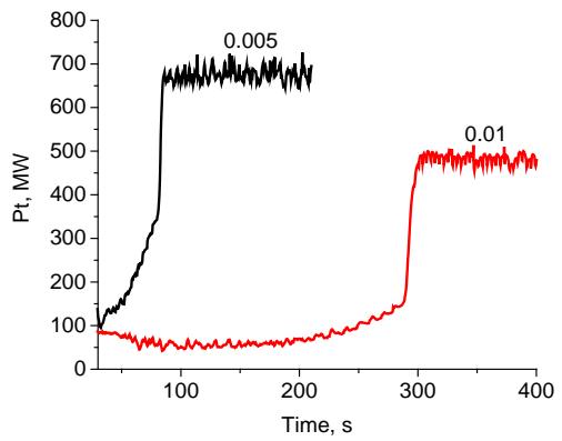 Figure 3: Time dependences of the fusion power of the reactor at various levels of anomalous losses. $P_{\mathrm{he}} = 120 \, \mathrm{MW}$, $< n > = 2.1 \cdot 10^{20} \, \mathrm{m}^{-3}$, $k_{\mathrm{b}} = 0.005$ and $0.01$, $E_{\mathrm{n}} = 7 \, \mathrm{eV}$, $k_{\mathrm{r}} = 0.25$, $\Delta = 1$.