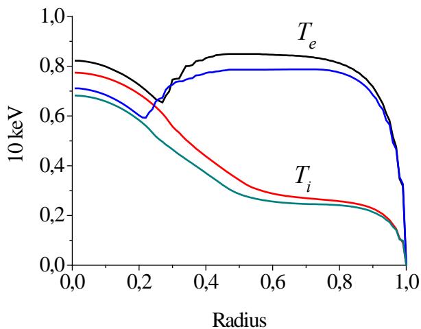 The equation of thermal conductivity of electrons (2) in the right part, except for the term with thermal conductivity, takes into account the heating of electrons arising during braking of $\alpha$ -particles born in fusion, heating from external energy sources, losses by braking and cyclotron radiation, heat exchange with ions due to Coulomb collisions and due to an ambipolar electric field. Equation of heat conduction for ions (3), except for heat exchange with electrons contains a source of external heating of plasma. Diffusion fluxes and heat fluxes in the heat conduction equation for ions were represented as a sum of neoclassical and bohmian fluxes. The diffusion equations for plasma and neutral atoms of deuterium and tritium, except for diffusion terms, contain as source and sink terms taking into account ionization of atoms. In equations (4) and (5) $S_{\delta} = n_{a}n < \sigma v > _{\mathrm{i}}$ the diffusion flux of electrons and the source, responsible for ionization of neutral particles in plasma, $S_{a} = n_{a}\upsilon_{T0} / \pi$ takes into account the flux of neutral atoms in plasma.