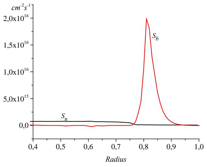 Figure 5: Spatial distribution of plasma density. $< n > = 2.1 \cdot 10^{20} \, \text{m}^{-3}$, $k_{\mathrm{b}} = 0.005$, $k_{\mathrm{r}} = 0$, $\Delta = 1$, $P_{\mathrm{he}} = 60 \, \text{MW}$, $P_{\mathrm{t}} = 780 \, \text{MW}$, $< Te > = 7.0 \, \text{keV}$, $< Ti > = 6.2 \, \text{keV}$. Figure 6: Diffusion fluxes depending on the plasma radius: $S_{n}$ - neoclassical, $S_{b}$ -bohmovs.