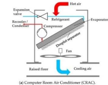 CRAC- Computer Room Air Conditioner is almost align with traditional air conditioning designed to maintain an optimal temperature in the data centers for their operations allowing key air distribution and humidity control in the server rooms for the data centers. CRAC in takes the warm air from the environment using a direct expansion on refrigeration cycle where the air is cooled through a cooling coil that has a refrigerant. The coil is kept cold by the compression where the excess heat is ejected through glycol mix with water and ambient air.