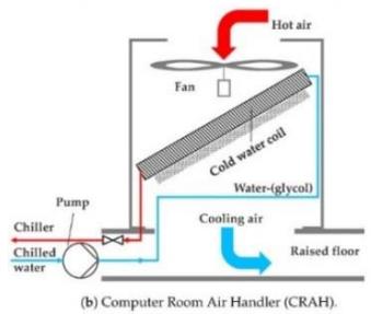 CRAH- Computer Room Air Handler are like CRAC. Instead of refrigerant, it has the chilled water that uses the fan to blow over the cooling coils to remove excess heat. This fills up with chilled water rather than the refrigerant which draws in the warm air from the computer room itself which is then transferred to regulate fan speed and ensure that the temperatures are at the optimal level to be stable allowing variability with humidity as well. [14]