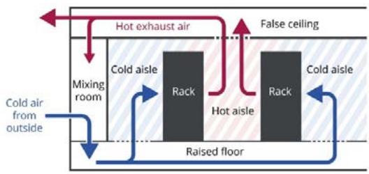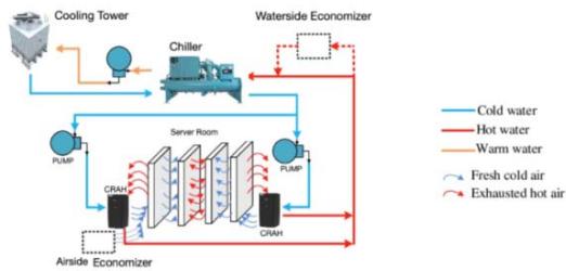 ii. Free Cooling Figure 5 As simple as it sounds the free cooling system principle follows drawing frigid air from the outside to maintain air flow for the cooling systems, this helps naturally cooling the data centers from the outside. however regardless of free cooling system it still uses pumps and fans to distribute the frigid air through the server racks in the data centers. Later it dissipates the warm air back into the environment outside the data center which has a significant recyclable cooling system. As a result, to improve efficiency and to significantly reduce energy cost using passive air from the outside. [27]