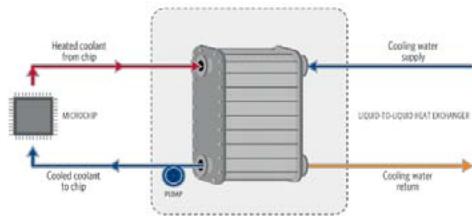 Direct-to-Chip-this component also uses a liquid coolant but rather than completely submerging the servers in the liquid, the liquid is transferred to the heatprone IT infrastructure such as the CPU, GPU, and memory which those components come with a cold plate attached to the chip. The coolant transfers those heat through the liquid itself through a closed looping system which eliminates the need of completely submerging the whole server in the liquid coolant and allows server density to increase effectively where the servers can be compacted in the data center making it effective for certain organisations to carry out their operations such as cloud computing and networking. [23]