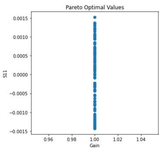 Initial Pareto set identified using MOGA executed NSGA2; evaluated the reflection coefficient S11 and Gain from the initial Pareto set, in next step obtained Pareto front in two-objective optimization using high-fidelity-based optimization, shown in Figure 9.