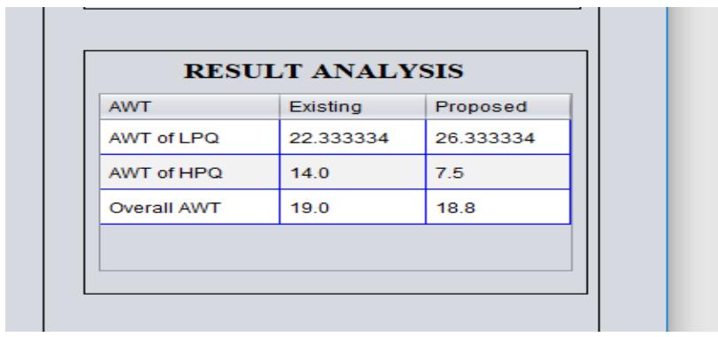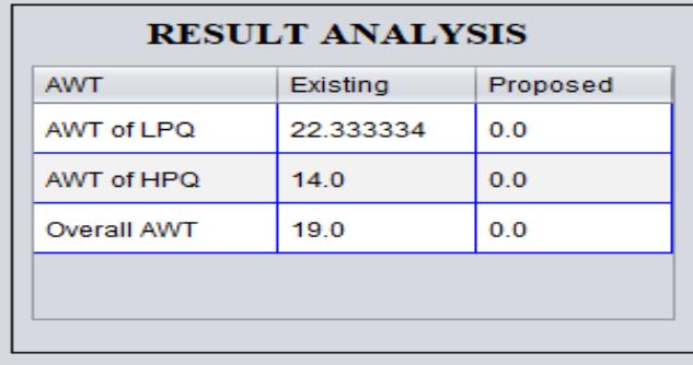 The figure below illustrates the application of the proposed algorithm, resulting in an average waiting time for high-priority processes of approximately 7.5. This value is nearly half of the average waiting time observed when using the existing algorithm. Furthermore, the overall waiting time for the process set is significantly reduced through the implementation of the proposed algorithm.