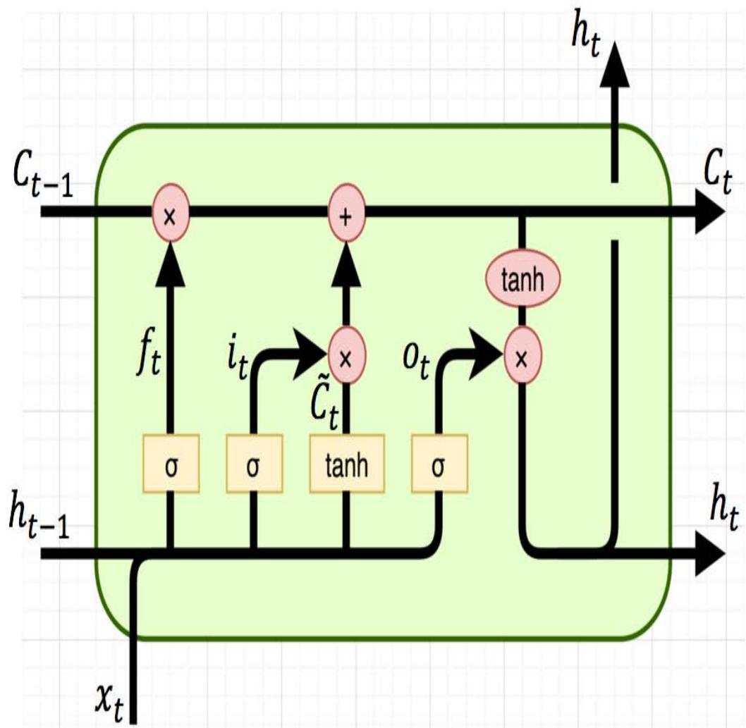 [15] describes the information flow for a typical LSTM memory cell—an LSTM memory cell has three gates: an input gate, a forget gate, and an output gate. Each of these gates is a way to let information flow optionally and is comprised of a sigmoid activation function. The sigmoid function squashes values between the range of [0, 1], representing how much information to let through a given gate. At the $t$ th timestep, the output from the previous LSTM memory cell, $h_{t-1}$, is fed into the forget gate, which determines how much information from the previous gate to keep, $f_t$. The output of the forget gate is then multiplied by the previous cell state. The input gate determines how much information from the most recent observation, $x_t$, to include in the cell state. The current cell state, $C_t$ is first passed through the tanh activation function and then multiplied with the output from the input gate, $i_t$, yielding $C_t$. Finally, the current cell state, $C_t$ is updated: