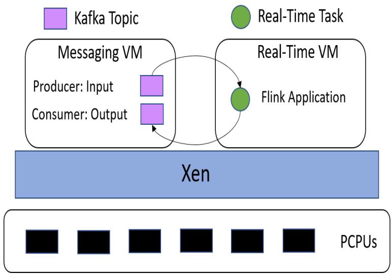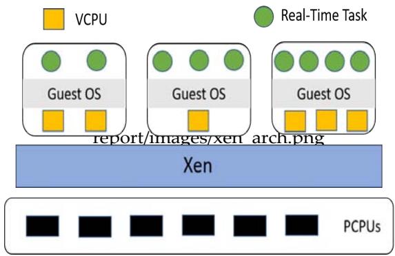 Xen [2] is a popular open-source virtualization platform that allows multiple virtual machines to share conventional hardware in a safe and resource-managed fashion. Xen serves as a virtual machine monitor (VMM) that lies between the hardware and guest operating systems. Xen controls a special domain called domain 0, which is responsible for managing all other guest domains. Each guest domain acts as a virtual machine (VM) and can specify its resource requirement in terms of the number of virtual CPUs (VCPUs). The typical Xen architecture is shown in Figure 2. Each VM has a guest operating system, which is responsible for scheduling tasks on to VCPUs. Xen is not only responsible for providing virtual resource interfaces to the VMs but is also responsible for scheduling the VMs onto physical CPUs (PCPUs). There are currently three different schedulers in Xen: Credit, Credit2, and RTDS. Credit is the default scheduler; it is a general-purpose weighted fair share scheduler. Credit2 is the evolution of the default credit scheduler; it is still based on a general purpose, a weighted fair share scheme, but it is more scalable and efficient with latency-sensitive workloads. RTDS is the real-time deferrable server scheduler that is specifically designed to handle real-time and latency-sensitive workloads [18].
