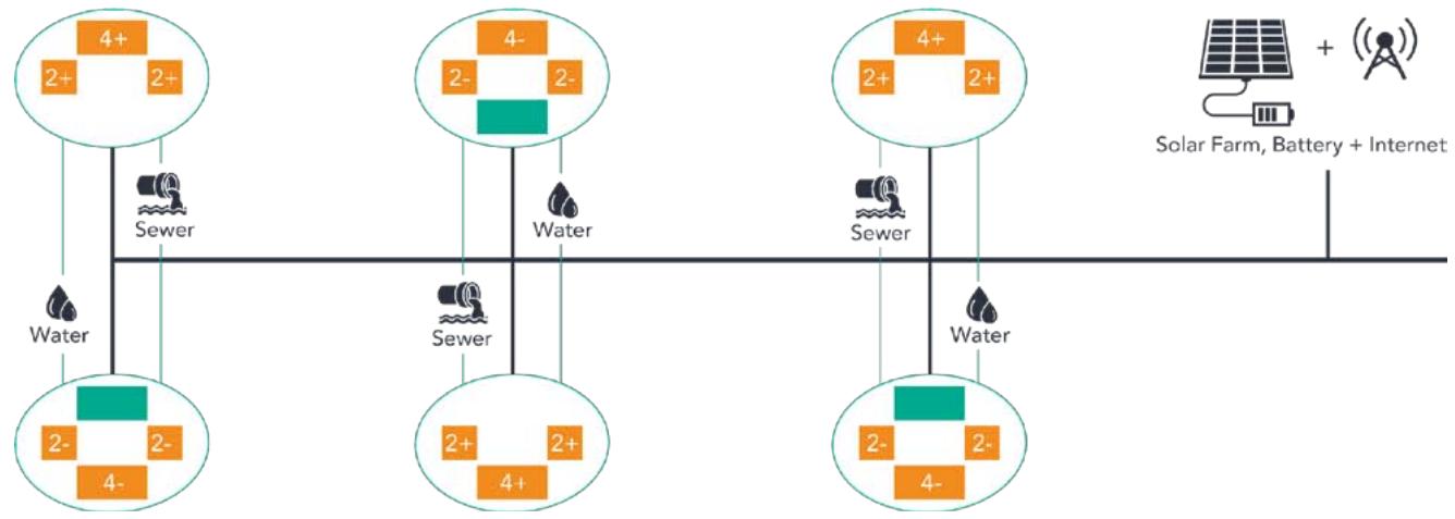 1,500l/day from the river, on average. Similarly, there is a small 500l/day sewerage treatment plant to serve each pair of unit clusters. Finally, there is one Starlink ground station at the solar farm with an Internet traffic switch/concentrator at each pair of clusters and Wi-Fi mesh nodes at each site.