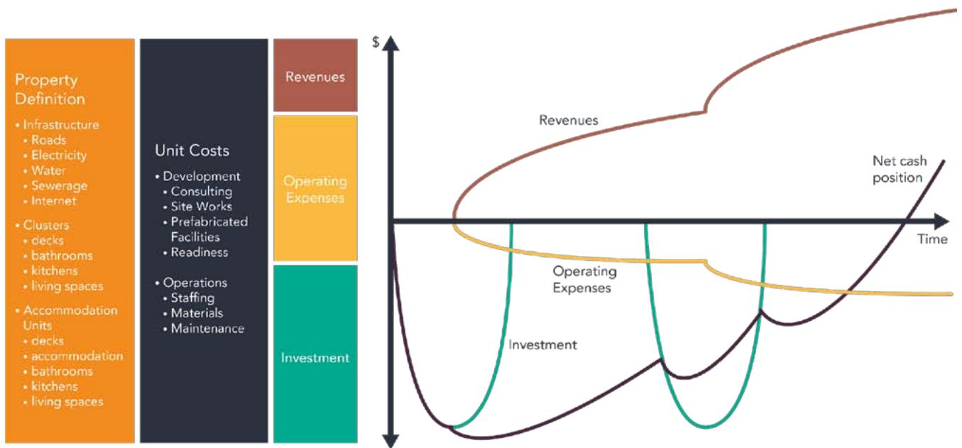 As illustrated by the graphs in Figure 1, once all the investments, revenues and costs are reasonably estimated, it is a simple matter to model the movements of money into and out of the venture over time. The graph in Figure 1 shows these cashflows over time. The estimated investments made to build property phases are shown in red, and revenues are shown in green and operating expenses are in yellow, and finally, the net cash position is shown in black. For any given point in time, the investment made to establish the venture, less the profit accruing after subtracting the subsequent operating costs from the corresponding operating revenues, gives the net cash the entrepreneur still has in