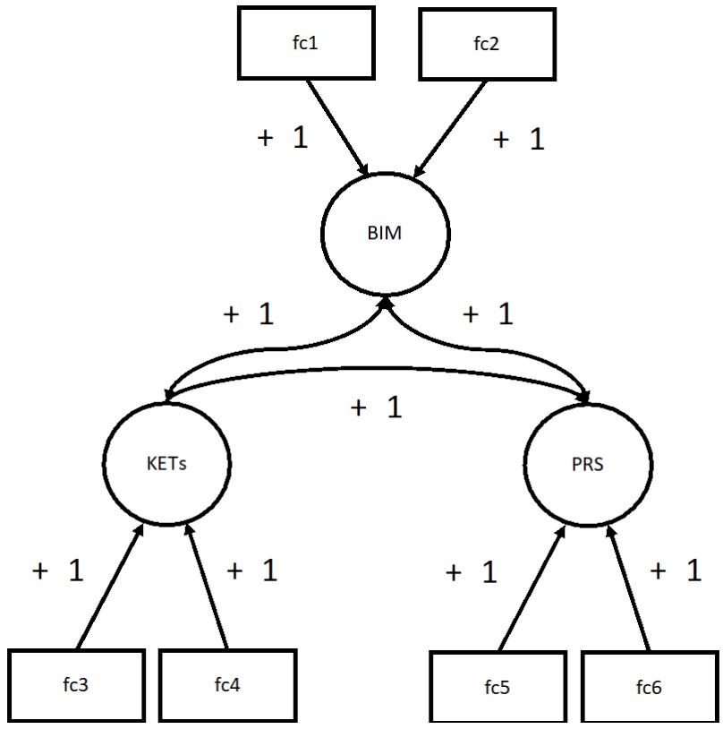 Figure 2: Has medium outlining for a null model for manufacturing survey results for discussion (arrows as causal hypotheses), focusing on contribution altogether, with BIMs with factors fc1-access and fc2-turn key innovation; KETs with factors fc3-automation and robotics and fc4-production control; and PRS, with factors fc5-online and fc6-maintenance provided —to achieve digital competitive advantage in Industry 4.0. Solid arrows depict validated causal connections between variables and factors, while double-headed arrows represent bidirectional correlations among BIMs, KETs, and PRS