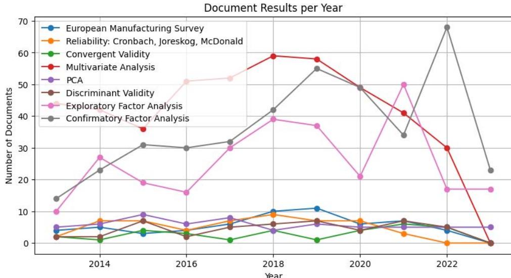 Prior EMS-based studies have utilized diverse statistical methods to analyze the survey data. The scoping review includes component analysis, reliability analysis through alpha, rho, and omega, and exploratory and confirmatory analyses. Structural path analysis shows multivariate analysis for discriminant and convergent validity assessments to implement in response to information characterization. Prior studies have shown depth in trade (European Commission, 2016; Kinkel et al., 2015). The lookup followed the format 'TITLE-ABS-KEY ("manufacturing" AND "statistic method")' to identify publications similar in the metadata. Results were filtered by year (2013-2023) for trends in