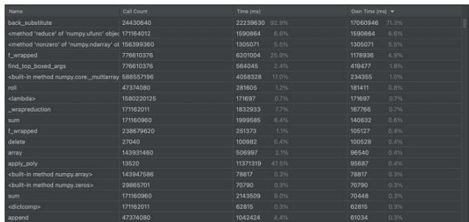 It was not possible to obtain a significant increase in performance using the GPU, since the method uses a large number of not very complex calculations. As a result, calculations slowed down 10 times. This happened because GPUs are adapted for calculating large matrices, while the CPU copes better with the proposed task. The use of other libraries and code optimization led to a 20 percent improvement in the execution speed of the back_substitute function. The overall running time of the algorithm was also improved by approximately $10\%$ (Fig. 14).