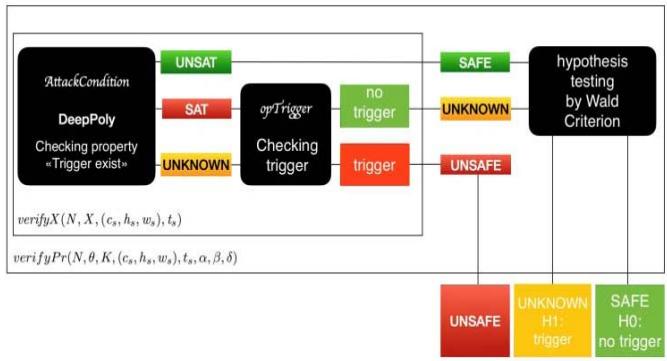 These results are then used in the VerifyPr function, which gives a probabilistic assessment of the presence of a trigger.