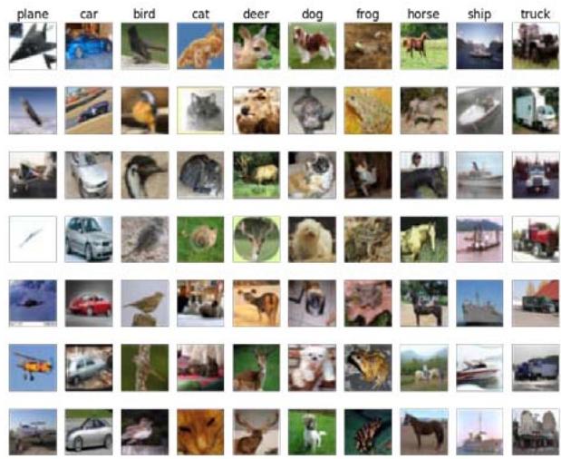 - CIFAR-10 - a set of three-channel images of $32 \times 32$ pixels. Images are divided into 10 classes — airplane, car, bird, cat, deer, dog, frog, horse, ship, truck (Fig. 16).