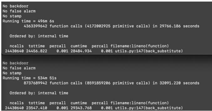 The time it takes to search for a trigger in a neural network depends on its architecture. The complexity of testing a neural network can be determined both empirically and theoretically. It will correlate with the number of parameters and depend on: the number of layers in the neural network, the size of these layers, the type of these layers. Empirically, it was found that fully connected layers are faster to check than convolutional layers. The verification time depends to a greater extent on the number of layers and to a lesser extent on their size.