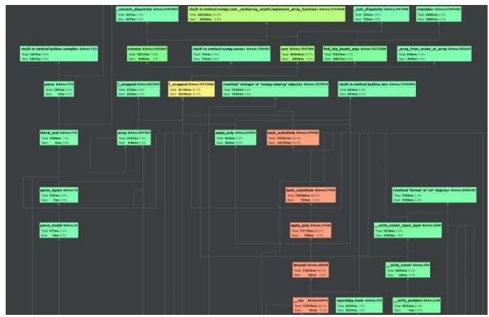 During the analysis of the repository, the bottleneck was identified — the back_substitute function of the utils.py module, which is responsible for the integration of interval arithmetic. Profiling of this program shows that about $70\%$ of the execution time is occupied by this function (Fig. 12). The calculation graph shows similar results (Fig. 13).