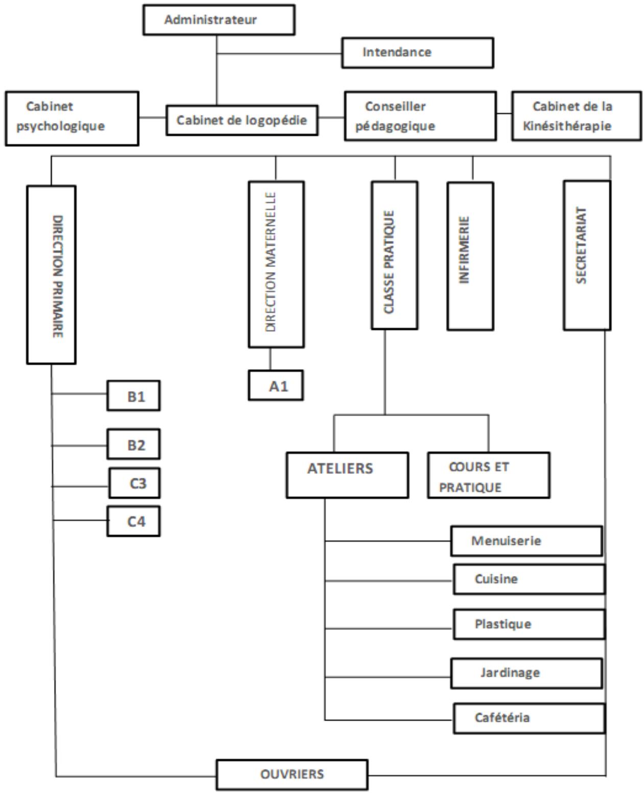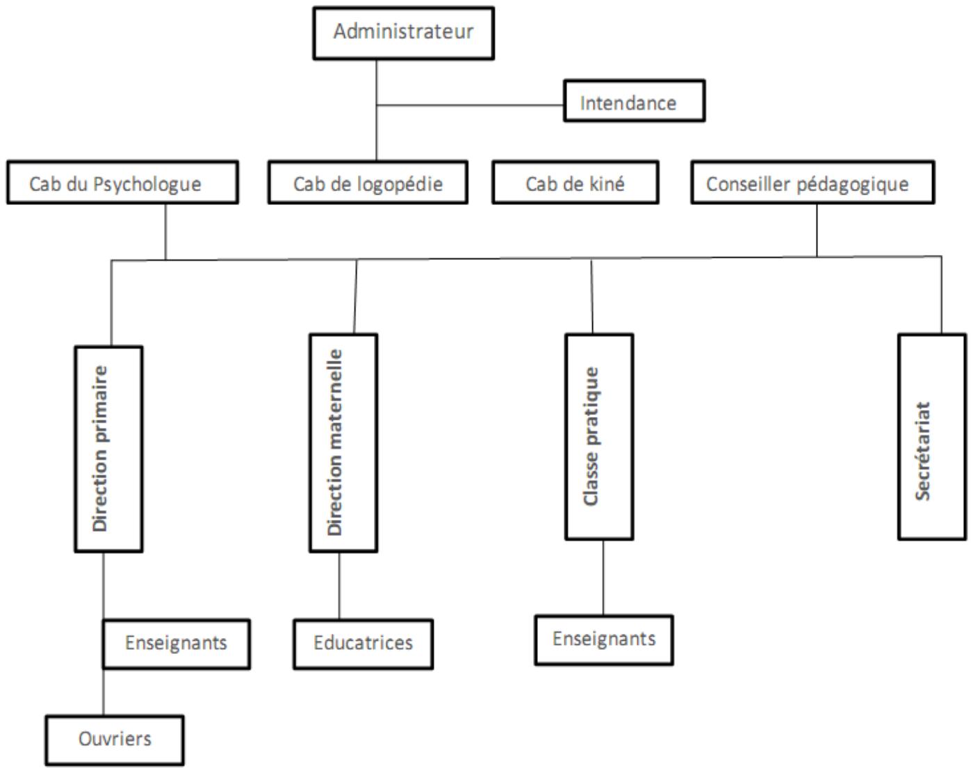primaire, direction maternelle, intendant comptable, secrétaire caissier, conseiller pédagogique, la logopédie, cabinet psychologique, la kinésithérapie et l'infirmerie.