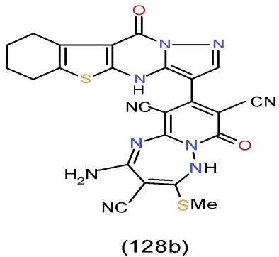 Escherichia coli is a large and various group of bacteria that is found naturally in the intestines of healthy humans and animals. Most types of Escherichia coli are harmless or cause relatively brief diarrhea, but some of the Escherichia coli can cause a disease for people which can be done by creating a toxin known as Shiga Toxin [36]. It can be seen clearly that pyridotriazepine 128b, which having pyrazolobenzothienopyrimidinyl moiety exhibited the highest antimicrobial activity against Escherichia coli compared with the tested 77 investigated compounds [8]. (Bio-3 scheme).