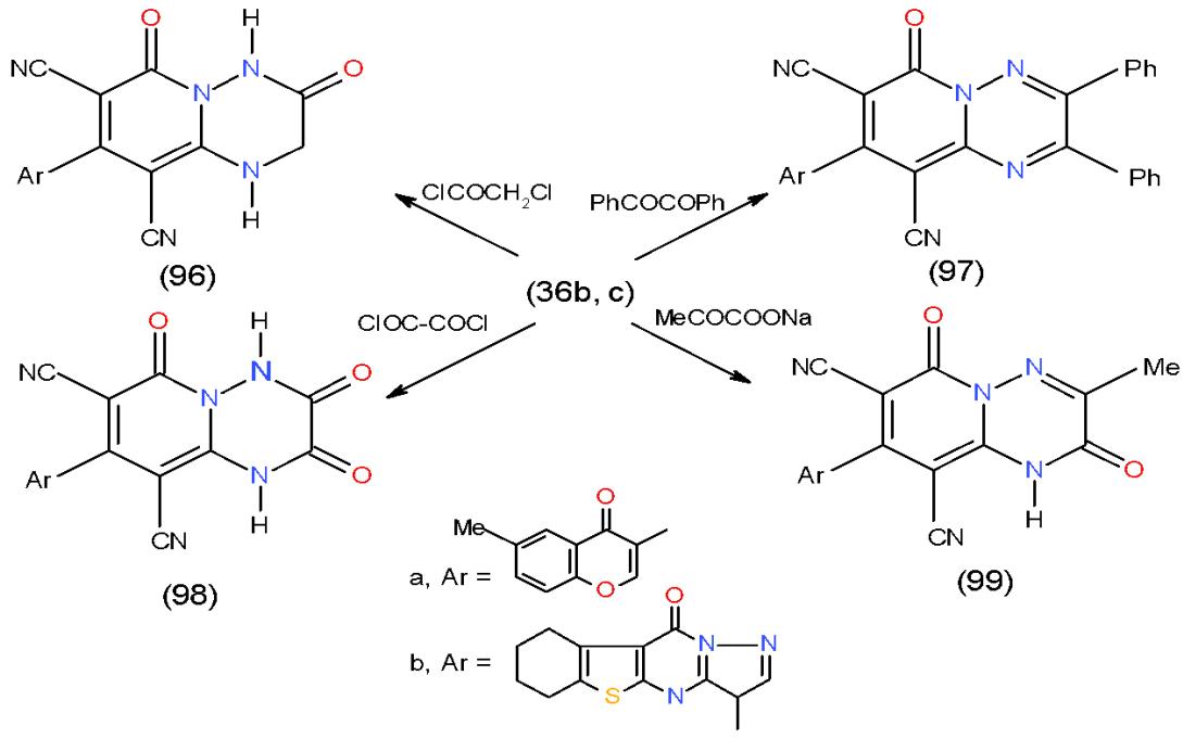The bicyclic heterocycles such as pyridotriazine and pyridopyridazine are useful for treating cell proliferative disorders, such as cancer, atherosclerosis, restenosis, angiogenesis, diabetic retinopathy, psoriasis, and endometriosis and immunological disorders [28]. Motivated by these facts we succeeded in the preparation of some pyridotriazines with the help of 1,6-diamino-4-aryl-2-oxo-1,2-dihydropyridine-3,5- dicarbonitriles (36a-c) as starting intermediate. Thus, the action of $\alpha$, $\beta$ - bifunctional electrophilic reagents such as chloroacetyl chloride, benzil, oxalyl chloride and sodium pyruvate upon compounds 36b, c was studied and yielded the corresponding nitrogen bridgehead pyrido 1,2,4-triazinones 96a, b- 99a, b, respectively, via cyclocondesation process \[14,15\](Scheme 20).