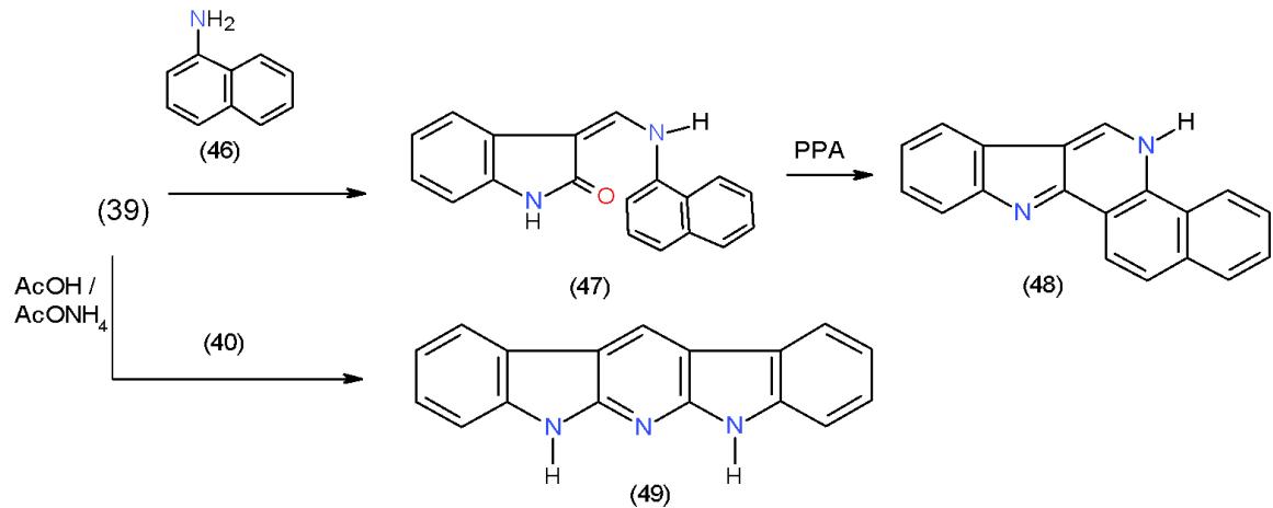 Scheme 9: Formation of indolopyridine derivatives On the other hand, treatment of 40 with 1-naphthylamine (46) yielded 3-N-naphthylamino derivative 47, which on boiling in poly phosphoric acid (PPA), dehydration took place giving rise to indolobenzoquinoline 48. Heating of indolinone (39) with enaminone 40 in acetic acid and ammonium acetate mixture furnished indolopyridoindole (49) \[18\](Scheme 10).
