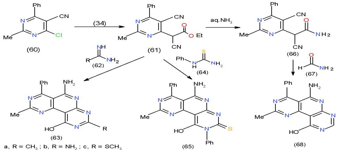 Nucleophilic substitution of the chlorine atom in chloropyrimidinecarbonitrile (60) using ethyl cyanoacetate (34) under basic condition afforded pyrimidinyl cyanoacetate derivative (61). Compound 61 is considered a good synthon for some interesting trinitrogenous heterocyclic systems having pyridine nucleus in their structures. Thus, cyclocondensation of 61 with acetami-dine hydrochloride (62a), guanidine hydrochloride (62b) and S-methylthiourea sulphate (62c) in sodium ethoxide solution furnished substituted pyrimidopyridopyrimidines 63a-c respectively. Similar behavior was observed when compound 61 also reacted with N-phenylthiourea (64) to afford pyrimidopyridopyrimidinethione 65. Moreover, treatment of 61 with aqueous ammonia at room temperature gave the corresponding amide 66, which reacted with formamide (67) in DMF to yield the substituted pyrimidopyridopyrimidines 68 \[22\](Scheme 13).