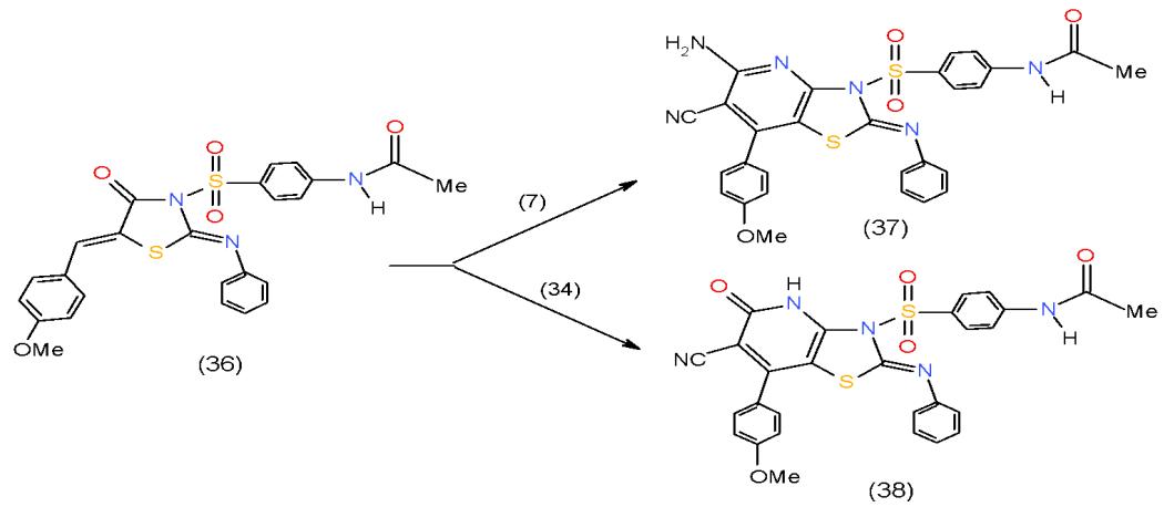 A number of methods to prepare thiazolopyridines have been documented in the literature. For example, methods that construct the bicycle by formation of a thiazole ring, include condensations of 3-amino-2-halopyridine, or 3-amino-2-pyridone derivatives, with thiocyanates, thioamides, or thioesters, condensations with 3-aminopyridin-2-thiones, and reactions of N-(2-pyridone-3-yl) acetamides with phosphorous pentasulfide, the oxidative ring-closure of 3-aminopyridine thioamides or thioureas, [16]. In our work, we annulated pyridineon thiazolidnone derivative using active methylene compounds. Thus, cyclocondensation of 5-arylidenethiazolidinone 36 with malononitrile (7) and ethyl cyanoacetate (34) in the presence of ammonium acetate yielded thiazolopyridine 37 and thiazolopyridone 38, respectively \[17\](Scheme 8).