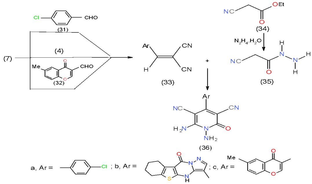 Condensation of malononitrile (7) with each of p-chlorobenzaldehyde (31), formyl derivative (4) and 3-formyl-6-methylchromone (32) afforded the respective arylidenemalononitriles 33a-c. In refluxing dimethyl formamide containing catalytic amount of piperidine cyanoacetic acid-hydrazide (35), the product of hydrazonolsis of ethyl cyanoacetate, (34) was added to arylidenemalononitriles 33a-c, and yielded the corresponding 1,6-diamino-4-aryl-2-oxo-1, 2-dihydropyridine-3,5-dicarbonitriles (36a-c) \[14,15\](Scheme 7). Compound 36 was considered as a suitable synthon for many fused pyridines.