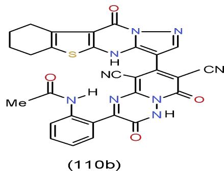 Infection of humans by the enteric pathogen Salmonella typhimurium generally results in severe abdominal cramping and diarrhea. These symptoms may largely result from the mucosal immune response elicited by this pathogen. Specifically, colonization of the human intestine by S. typhimurium leads to infiltration of polymorphonuclear leukocytes (PMNs) into the intestinal epithelium culminating in the formation of an intestinal crypt abscess [37]. Results obtained disclosed that pyrido1,2,4-triazinedione 110b [15], which having pyrazolobenzothieno- pyrimidinyl moiety exhibited the highest antimicrobial activity against Salmonella typhimurium compared with the tested compounds \[15\](Bio-4 scheme).
