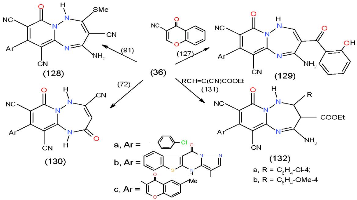 Moreover, the action of 2-cyano-3,3-bis (methylthio)acrylonitrile (91) and chromone-3-carbonitrile 127 upon 36a-c yielded pyrido1,2,4-triazepines 128a-c and 129a-c, respectively. Also, Treatment of 36a with ethyl exothymethylenecyanoacetate (72) gave pyrido1,2,4-triazepine- tricarbonitriles 130 while, the reaction of 36b, c with arylidene cyanoacetate (131) produced aminopyrido1,2,4-triazepinedicarbonitriles 132a, b, respectively \[14-31\](Scheme 26).