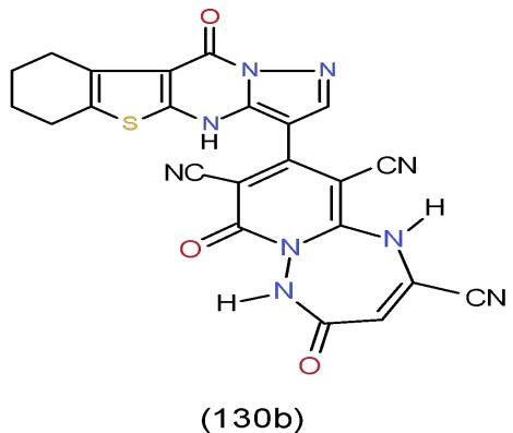 A Gram-positive Bacterium Bacillus subtilis, like many microorganisms, can form most of the enzymes needed for the biosynthesis of the amino acid tryptophan. The primary role of tryptophan within living organisms is as a novel residue within many proteins. The efficient production of secreted enzymes B. subtilis is considered a key drivers of the successes in the enzyme industry [34]. The selected synthesized heterocyclic compounds were tested against Bacillus subtilis. The results showed that pyrido1,2,4-triazepinetricarbonitriles 130b, which carrying pyrazolobenzothienopyrimidinyl nucleus [15] exhibited the highest antimicrobial activity against Bacillus subtilis compared with the tested compounds in the study. (Bio-1 scheme).