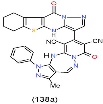 Aspergillus fumigatus is an opportunistic fungus causing allergic and invasive aspergillosis in humans and animals. It secretes an array of complex biologically active glycoprotein antigens and allergens, that have been implicated in human respiratory allergic disorders [39]. The compounds carrying pyrazolobenzothienopyrimidinyl moiety in their structures such as pyrido 1,2,4-triazepine 136a and pyrazolopyrido1,2,4-triazepine 138a may be used as antimicrobial agent against Aspergillus fumigates as they shown the highest inhibition zones \[15\](Bio-7 scheme).