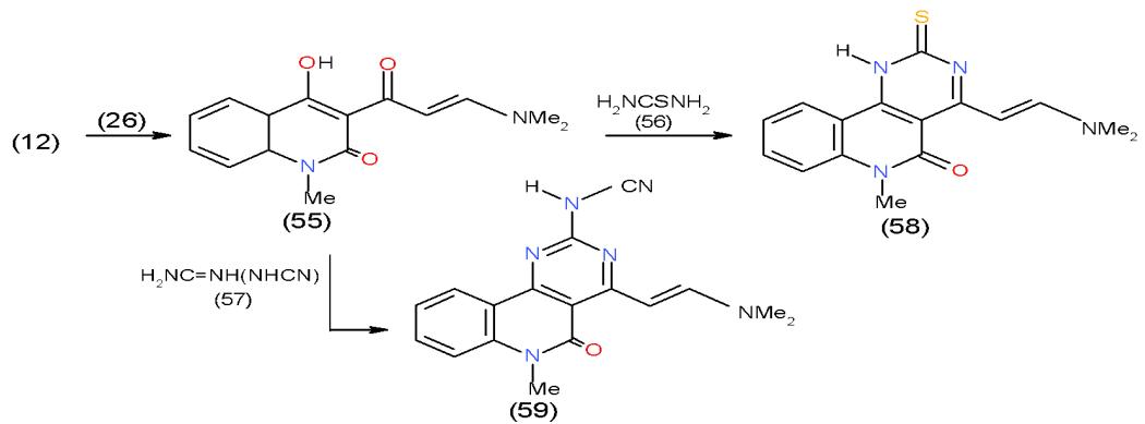 Scheme 11: Formation of pyridopyrimidopyrimidine derivatives On the other hand, Condensation of 3-acetyl quinolinone 12 with DMFDA (26) yielded the enaminone 55. The action of thiourea (56) and cyanoguanidine (57) upon the enaminone 55 gave rise to pyrimidoquinolinones 58 and 59, respectively \[21\](Scheme 12).