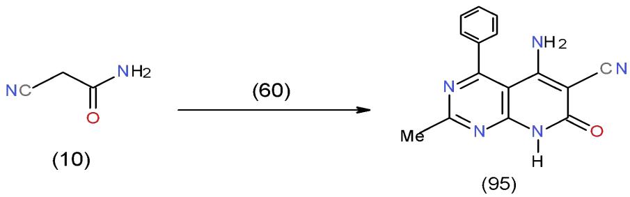 Also, the reaction of 4-chloropyrimidine-carbonitrile 60 with cyanoacetamide (10) in boiling dimethyl formamide gave aminopyridopyrimidinecarbonitrile 95 \[27\](Scheme 19).
