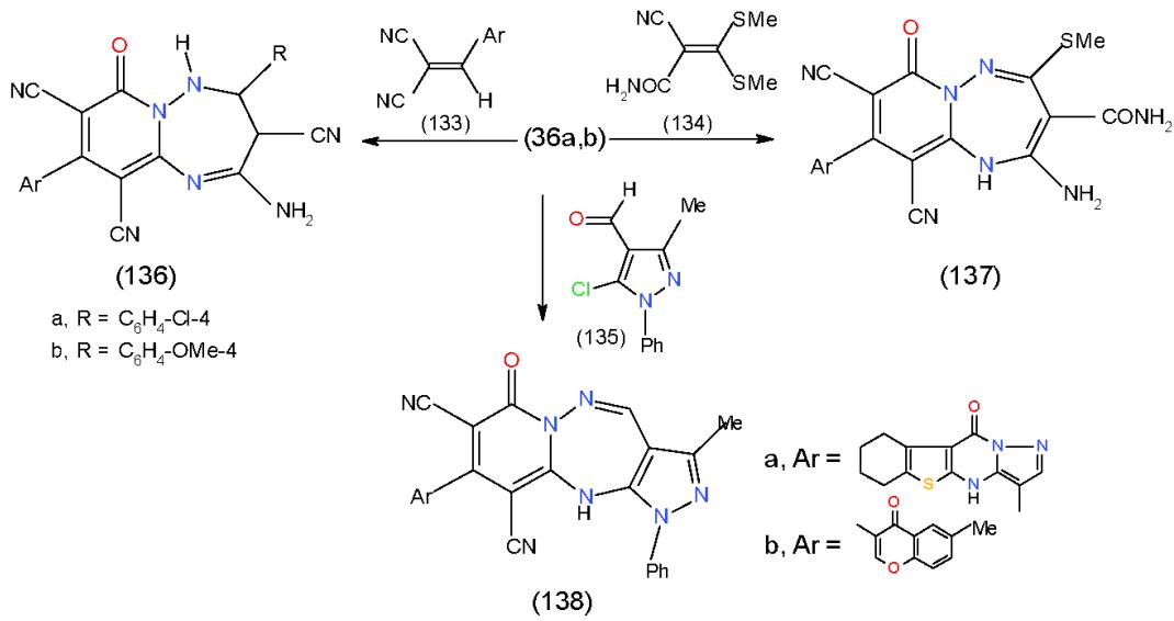 Furthermore, cyclocondensation of 36b, c with arylided malonitrile (133), 2-cyano-3,3-bis(methyl thio) prop-2-enamide (134) and o-chloroaldehyde derivative 135 gave the corresponding pyrido- 1,2,4-triazepines 136a, b, 137a, b and 138a, b, respectively \[14,15\](Scheme 27).