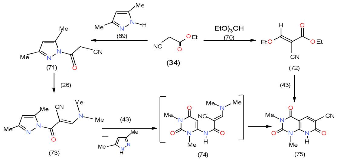 Recently, an analogous method for the synthesis of pyridopyrimidines was proposed via the reaction of 6-amino-2-thiouracil with activated olefinic system possessing a leaving group such as dimethyl-amino [23]. Motivated by this fact, we allowed ethyl cyanoacetate (34) to react with both 3,5-dimethylpyrazole (69) and tiethylorthoformate (70) to afford 3,5-dimethylpyrazol-1-yloxo) acetonitrile (71) and ethyl ethoxymethylenecyanoacetate (72), respectively. Treatment of 71 with DMFDA (26) yielded the enaminone 73, which reacted with 6-aminouracil 43 to give the pyridopyrimidine 75 via non-separable intermediate 74. Compound 75 was also obtained from the reaction of 6-aminouracil 43 with compound 72\[24\](Scheme 14).
