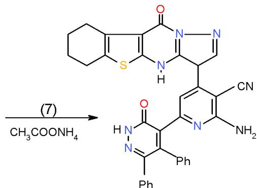 $\alpha$, $\beta$ -Unsaturated ketones are called chalcones or enones was synthesized via the interaction of aromatic aldehydes with compounds having active methylene or methyl groups in their structures. The activated influence of the carbonyl group on the exocyclic double bond render the enones susceptible to the cycloaddition reaction forming the target pyridines. The preparation of a novel pyridines bearing substituted heterocyclic systems requires the formation of biheterocyclicenones such as the enone (3), which synthesized via Knoevenagel condensation of 3-formylchromone (1) with thiazolidene-2, 4-dione (2) having an active cyclic methylene group [7]. Whereas, the biheterocyclic enone 6 performed by condensation of formyl derivative of pyrazolobenzothieno-pyrimidinidine (4) with 4-acetylpyridazinone 5 having an active methyl group \[8\](Scheme 1).