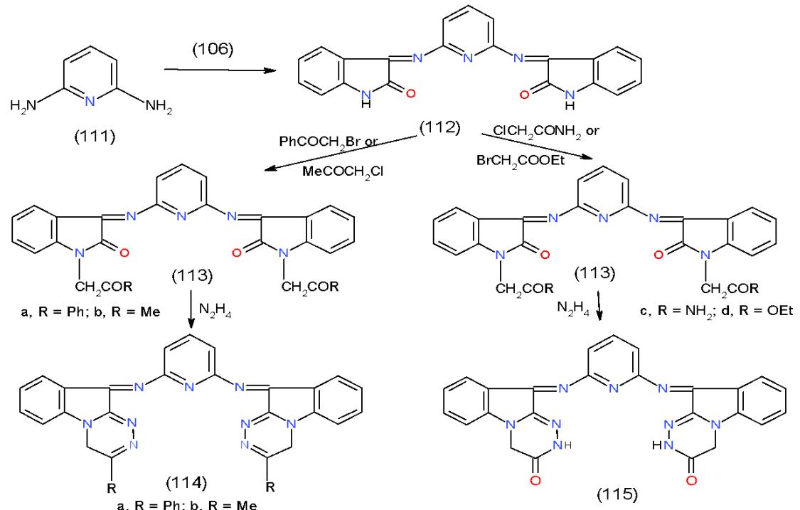 alkylation of 112 with chloroacetamide and ethyl bromoacetate furnished 2,6-bis(1-substitutedindolimino) pyridine (113c, d), which on fusion with hydrazine hydrate produced 2,6-bis(1,2,4-triazinoindolimino) pyridinone 115 \[29\](Scheme 23).