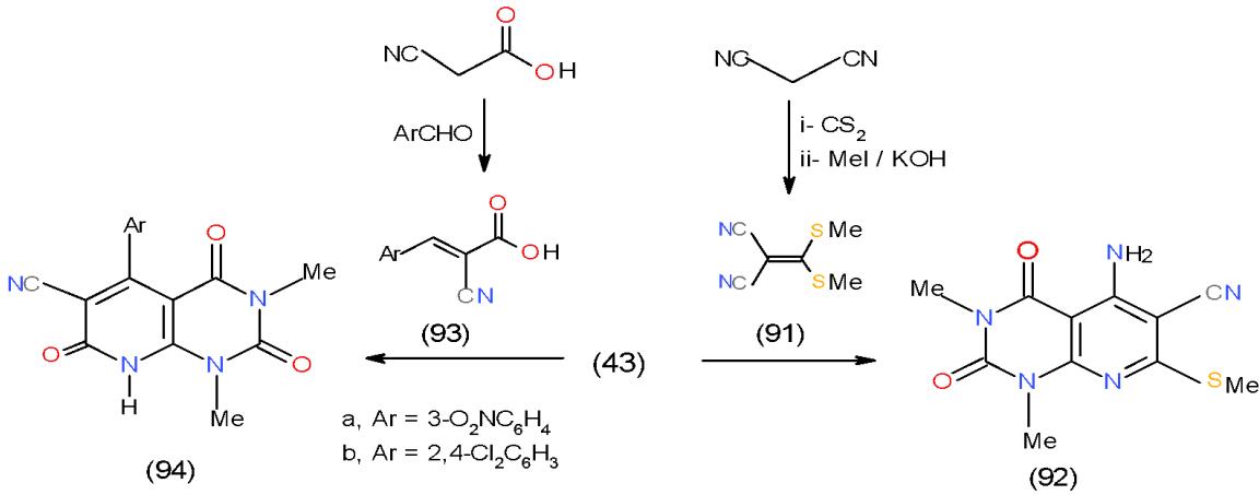 reaction of 43 with arylidenecyano acetic acids 93a, b, obtained from the condensation of cyanoacetic acid with aromatic aldehydes afforded pyrido- pyrimidine-triones 94a, b \[20\](Scheme 18).