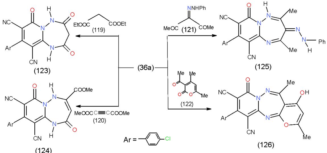 The literature survey of 1,2,4-triazepines, synthesis and reactions of monocyclic and fused heterocycles incorporating 1,2,4-triazepines as well as their biological evaluation and synthetic applications was described [30]. As a part of our program directed for the synthesis of new polynuclear bioactive heterocyclic systems, one of our synthetic strategy is designed to utilize of 1,6-diamino-4-aryl-2-oxopyridine-3,5-dicarbonitrile 36a-c as a suitable synthon for the synthesis of nitrogen bridge-head pyrido[1,2,4]-triazepines. Accordingly, treatment of 36a with diethyl malonate (119), diazotized acetylacetone (120), dimethyl acetylenedicarboxylate (121) and dehydroacetic acid (122) furnished substituted pyrido1,2,4-triazepines 123-126, respectively \[31\](Scheme 25).