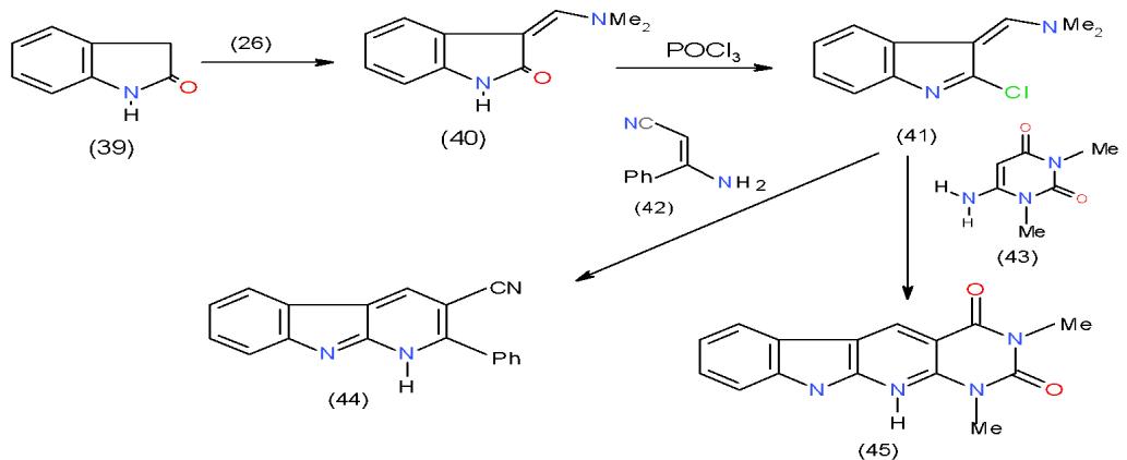 In the last 30 years' hundreds of indoloquinoline analogues were synthesized and their biological activities evaluated as scaffolds for drug discovery. This fact aroused us to synthesize some bioactive indolopyridines starting with 2-indolinone (39) was studied. Thus, condensation of 2-indolinone (39) with DMFDA (26) afforded the respective enaminone (40), which on treating with $\mathrm{POCl}_3$ gave 2-chloroindole derivative 41. Cyclocondensation of 41 with two compounds having active methane site in their structures such as, enaminonitrile 42 and 6-aminoaminouracil 43, afforded the indolopyridine-carbonitrile 44 and indolopyridopyrimidinedione 45, respectively \[18\](Scheme 9).